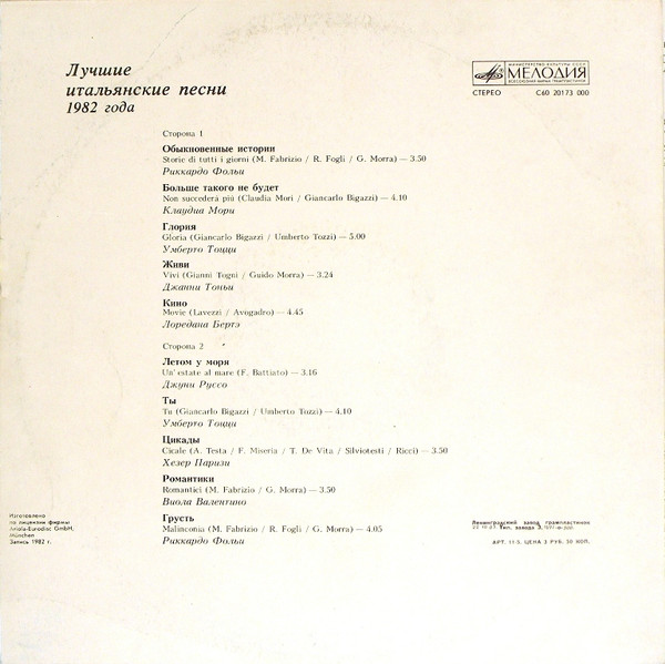 Najlepsze włoskie piosenki 1982 roku to wyjątkowa kompilacja największych przebojów włoskiej sceny muzycznej początku lat 80. Wydana w ZSRR, ta płyta winylowa stanowi nie tylko muzyczną podróż do słonecznej Italii, ale również nostalgiczne wspomnienie złotej ery włoskiej piosenki na początku lat 80-tych.