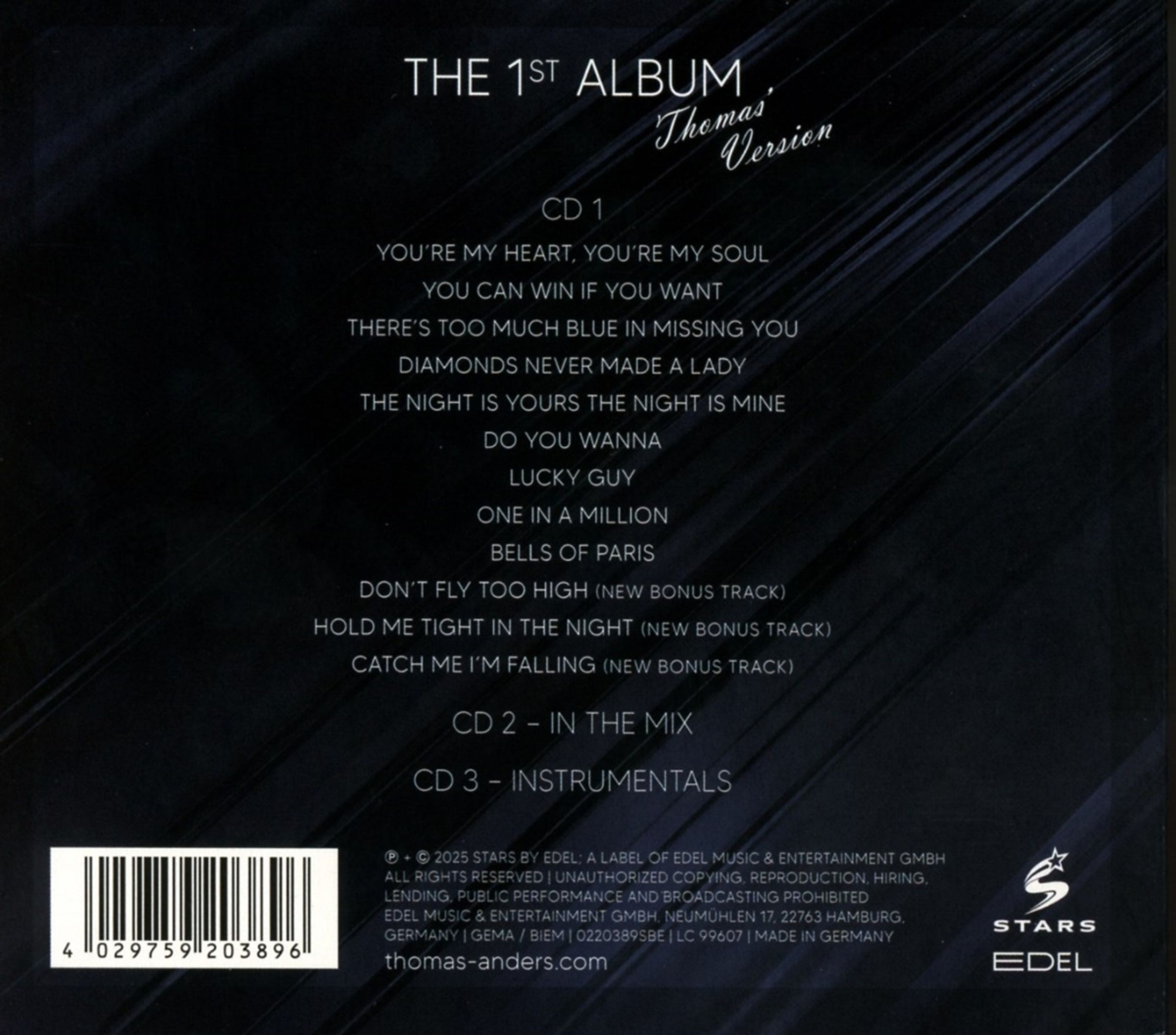 Album zawiera kultowe utwory zespołu Modern Talking w nowych interpretacjach Thomas Anders — charakterystycznego głosu grupy, który przez dekady zachwyca fanów na całym świecie. The 1st Album to sentymentalna podróż do złotej ery muzyki pop, pełnej chwytliwych melodii, romantycznych tekstów i niepowtarzalnego brzmienia lat 80.